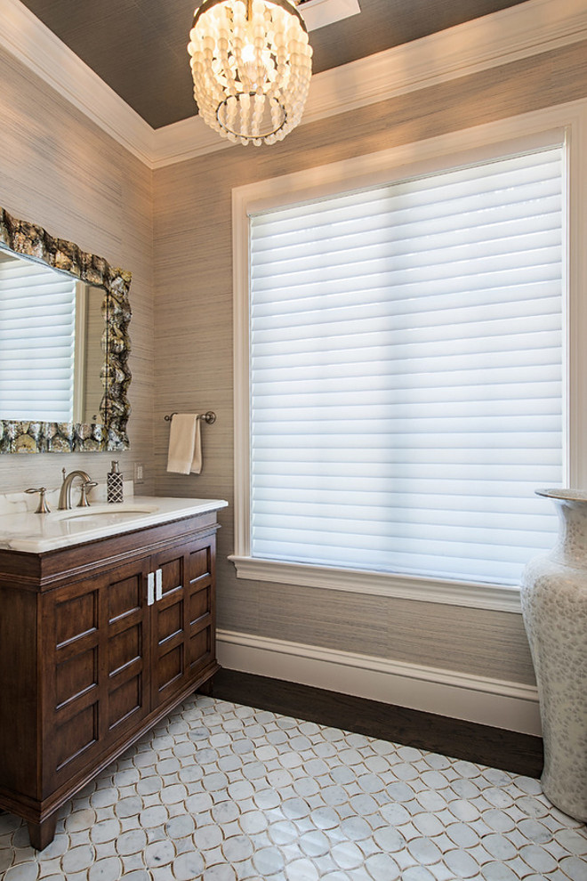 Gold And Gray Powder Room With Damask Wallpaper